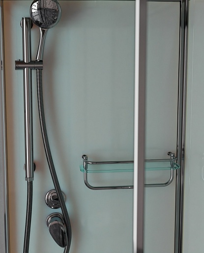 - Стеклянная полочка с ограничителем и вешалкой для банных аксессуаров.