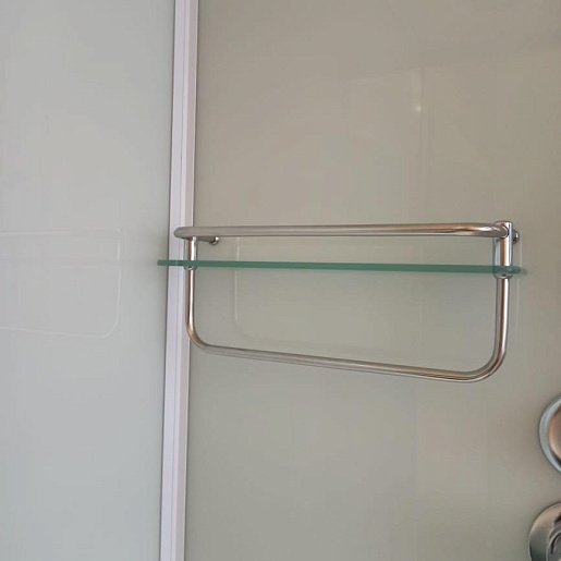 - Стеклянная полочка с ограничителем и вешалкой для банных аксессуаров.