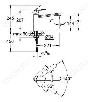 - область поворота 140°