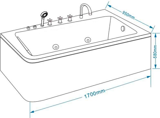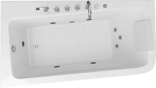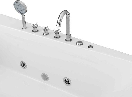 Комплектация: ванна, каркас, смеситель с душевой лейкой, система гидромассажа, подголовник, сифон.