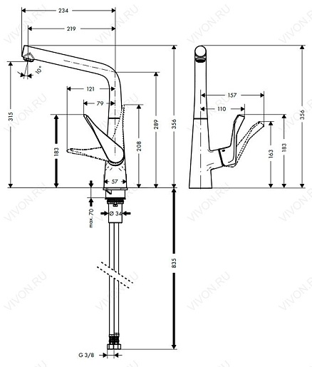 - поворотный излив устанавливается в трех положениях: 110°, 150° или 360°