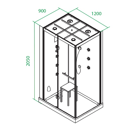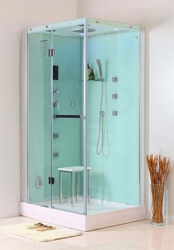 - Смеситель, радио, парогенератор, подсветка, вентилятор, верхний душ, ручная лейка A11012, стальной шланг IDDIS 1,5 м (double lock), полка, сиденье;