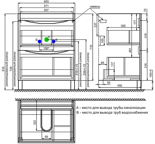 - В верхнем ящике расположен ограничитель под сифон, в нижнем ящике - органайзер.