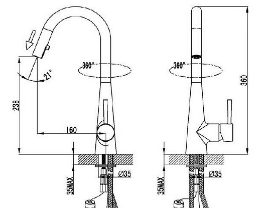- поворотный излив с выдвижным душем