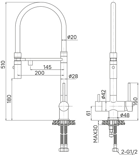- Гибкая подводка из нетоксичной EPDM резины в оплетке из нержавеющей стали, М10 - G1/2.