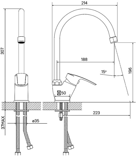 Комплектация: смеситель, гибкая подводка.