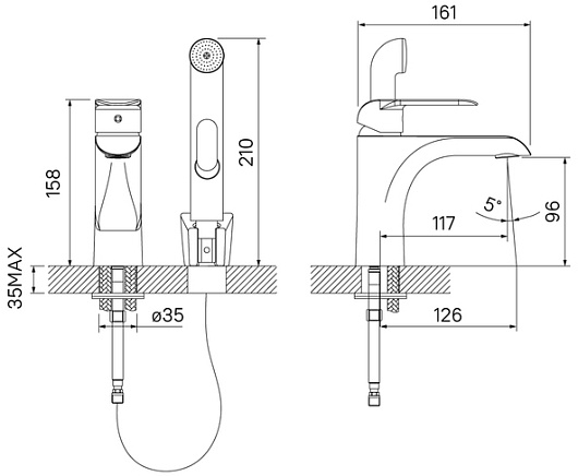 Комплектация: смеситель, гибкая подводка, гигиеническая лейка, шланг, держатель для лейки.