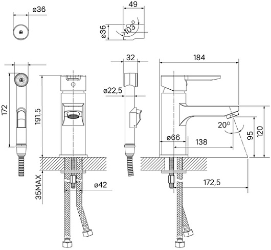 Комплектация: смеситель, гибкая подводка, гигиеническая лейка, шланг, держатель для лейки.