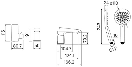 Комплектация: смеситель, гибкая подводка, душевая лейка, шланг, держатель лейки.