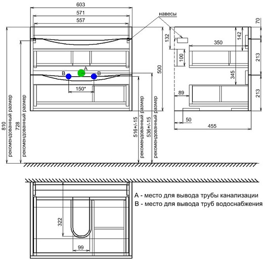 - В верхнем ящике расположен ограничитель под сифон, в нижнем ящике - органайзер.
