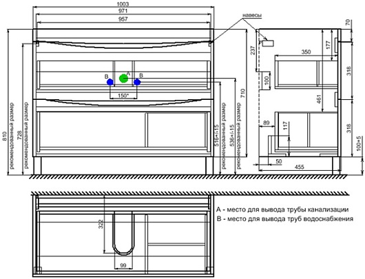 - В верхнем ящике расположен ограничитель под сифон, в нижнем ящике - органайзер.