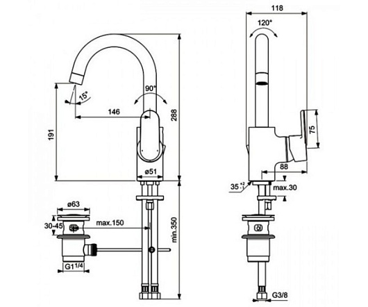 Высота излива, мм: