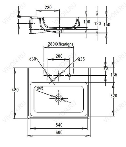 - в случае установки раковины на мебель предусмотрены размеры выреза 50x40 мм.