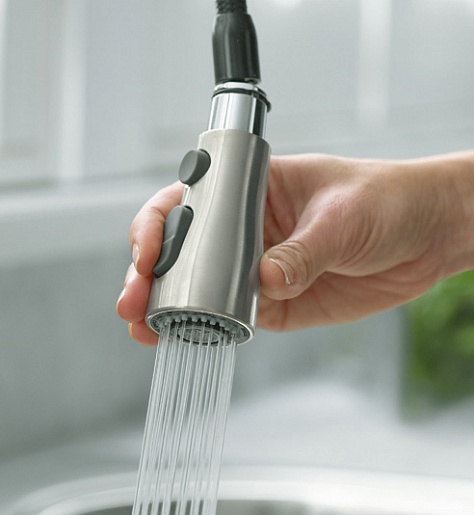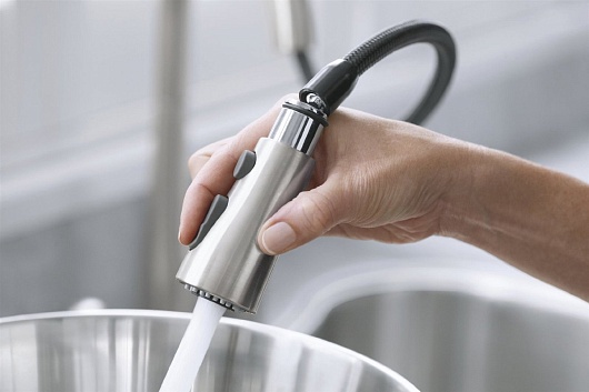 - Благодаря гибкому шлангу из нейлона и шарниру достигается плавность хода выдвижного излива.
