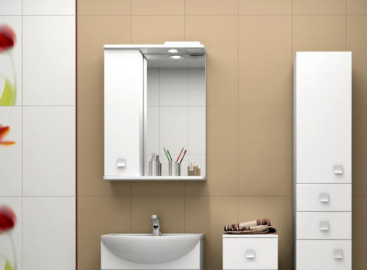 Комплектация: Зеркальное полотно с нижней полкой и козырьком с встроенным галогеновым светильником и выключателем. Слева распашной шкаф с внутренней полкой.