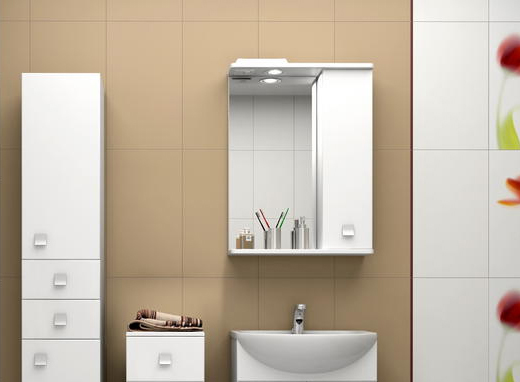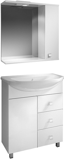 Комплектация: Зеркальное полотно с нижней полкой и козырьком с встроенным галогеновым светильником и выключателем. Справа распашной ящик с внутренней полкой.