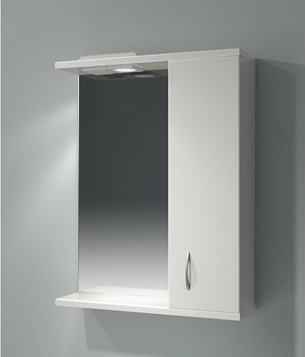 Комплектация: Зеркальное полотно с нижней полкой и козырьком с встроенным галогеновым светильником и выключателем. Справа распашной ящик с внутренней полкой.