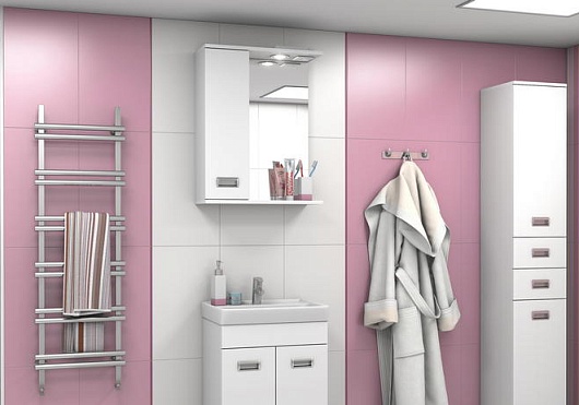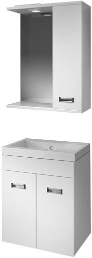 Комплектация: зеркальное полотно с нижней полкой, козырьком с галогеновым светильником и выключателем. Справа расположен распашной шкаф с вкладными полками и хромированной металлической врезной ручкой.