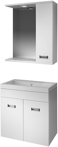 Комплектация: зеркальное полотно с нижней полкой, козырьком с галогеновым светильником и выключателем. Справа расположен распашной шкаф с вкладными полками и хромированной металлической врезной ручкой.