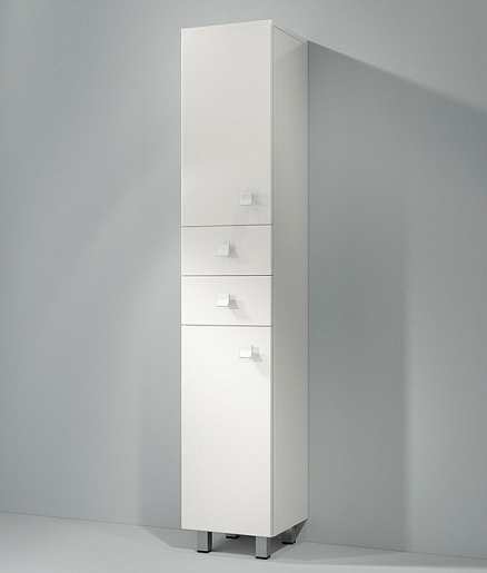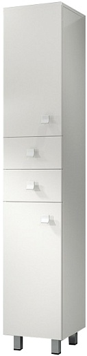 Описание: напольный пенал для ванной на ножках с двумя распашными дверцами и двумя выдвижными ящики. Металлические хромированные ручки и ножки. Универсальная ориентация.
