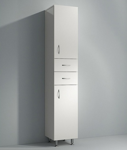 Описание: напольный пенал для ванной на ножках с двумя распашными дверцами и двумя выдвижными ящики. Бельевая корзина, металлические хромированные ручки и ножки.