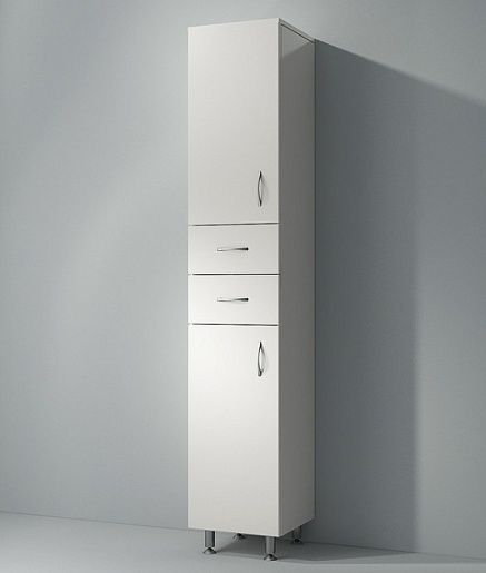 Описание: напольный пенал для ванной на ножках с двумя распашными дверцами и двумя выдвижными ящики. Бельевая корзина, металлические хромированные ручки и ножки. Универсальная ориентация.
