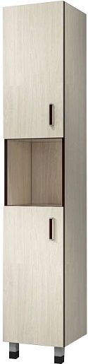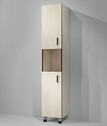 Описание: напольный пенал для ванной на ножках с двумя распашными дверцами и нишей по центру. Металлические хромированные ручки со вставкой и ножки.