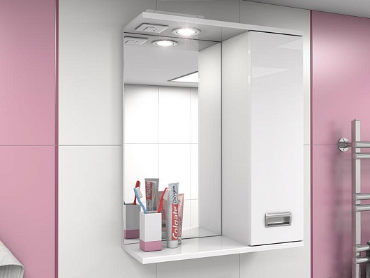 Комплектация: зеркальное полотно с нижней полкой, козырьком с галогеновым светильником и выключателем. Справа расположен распашной шкаф с вкладными полками и хромированной металлической врезной ручкой.