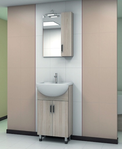 Комплектация: влагостойкое зеркальное полотно, может быть дополнено светильником. Распашной шкаф с вкладными полками.