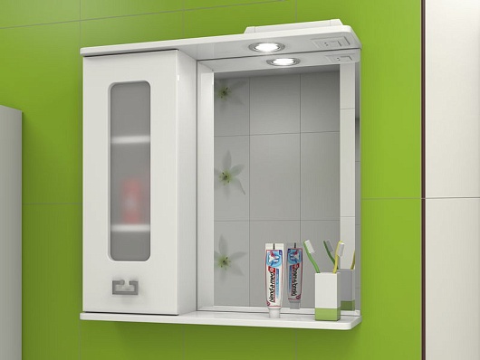 Комплектация: Зеркальное полотно с нижней полкой и козырьком с встроенным галогеновым светильником и выключателем. Слева распашной ящик с внутренними полками.