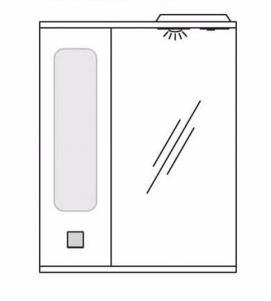 Комплектация: Зеркальное полотно с нижней полкой и козырьком с встроенным галогеновым светильником и выключателем. Справа распашной ящик с внутренними полками.