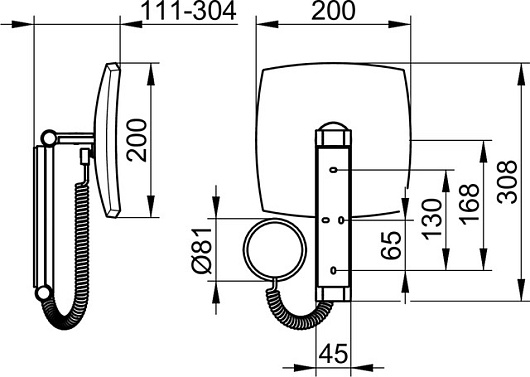 - одностороннее зеркало, вогнутое, коэффициент увеличения x 5