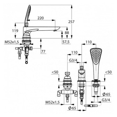 - комплект: крепления, душевой шланг, душевая лейка, аэратор, гибкая подводка, дивертор