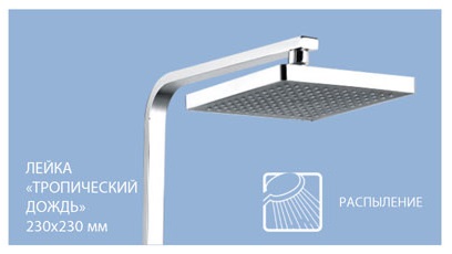 - верхняя поворотная душевая лейка «Тропический дождь» 203х203 мм.