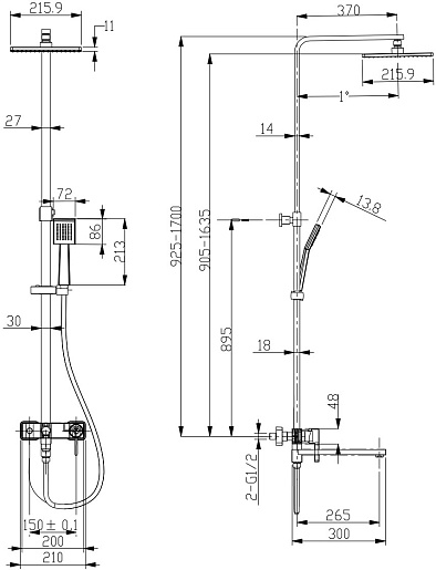 Комплектация: смеситель, шланг, душевая лейка, держатель лейки, верхний душ, штанга.