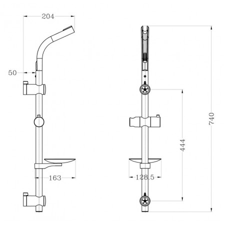 Комплектация: стойка для душа, регулируемое по высоте крепление для лейки, мыльница