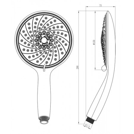6-функциональная Ø150 мм. Режимы: распыление, массаж, туман, распыление и массаж, распыление и туман, эко-режим.