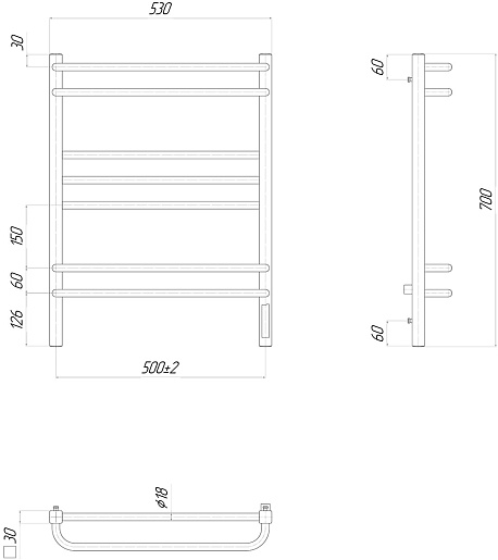 Комплектация: полотенцесушитель, крепление телескопическое (4 шт.), элемент для скрытого подключения к электросети, кабель сетевой - 1.5 м.