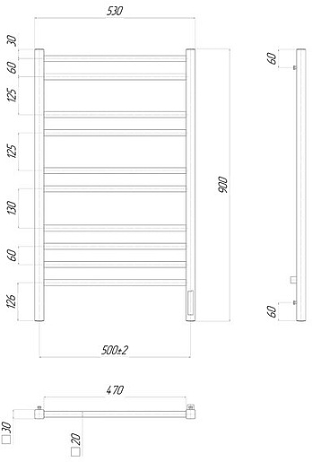 Комплектация: полотенцесушитель, крепление телескопическое (4 шт.), элемент для скрытого подключения к электросети, кабель сетевой - 1.5 м.