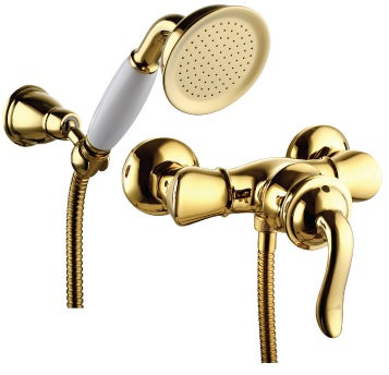 - Комплектация: душевой шланг, душевая лейка, настенный держатель, эксцентрики