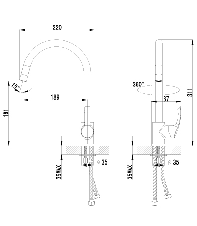 - поворотный высокий излив 189 мм