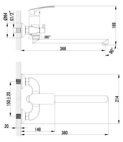 - плоский поворотный излив 366 мм