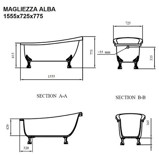 Magliezza Акриловая ванна на лапах Alba (155,5x72,5) ножки золото