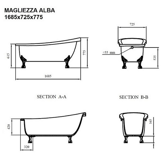 Magliezza Акриловая ванна на лапах Alba (168,5х72,5) ножки золото