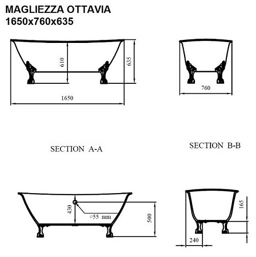 Magliezza Акриловая ванна на лапах Ottavia (165х76) ножки золото