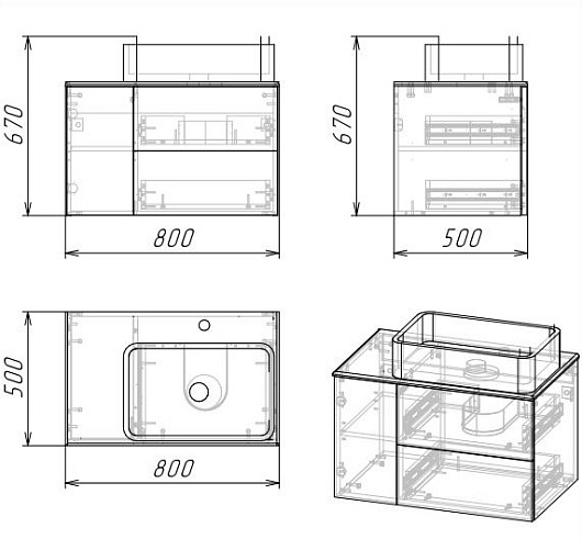 В комплекте: тумба, раковина, зеркальный шкаф, крепеж.