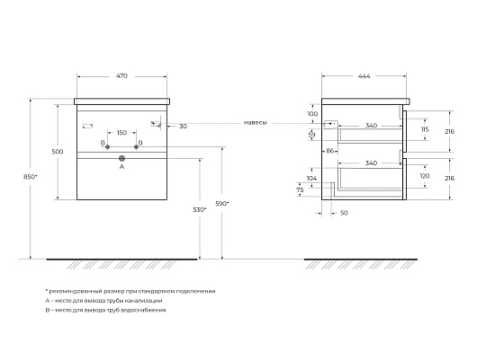 - База под раковину подвесная с двумя выкатными ящиками, с доводчиками, ALBANO-CER-500-2C-SO-CVG