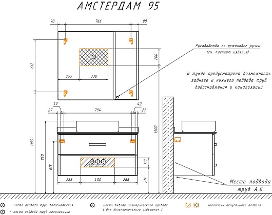 В комплекте: тумба, столешница, раковина, зеркальный шкаф, крепеж.