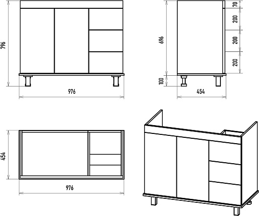 Комплектация: тумба, раковина, зеркало, ножки, крепеж.