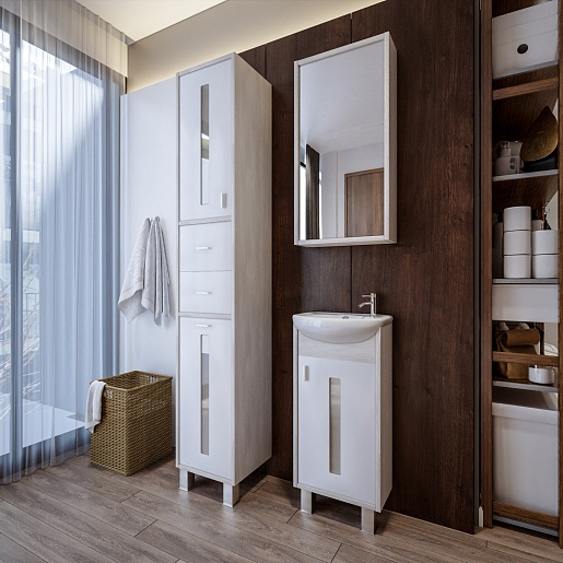 Комплектация: тумба под раковину, раковина, зеркальный шкаф, крепления, ножка (2 шт.).